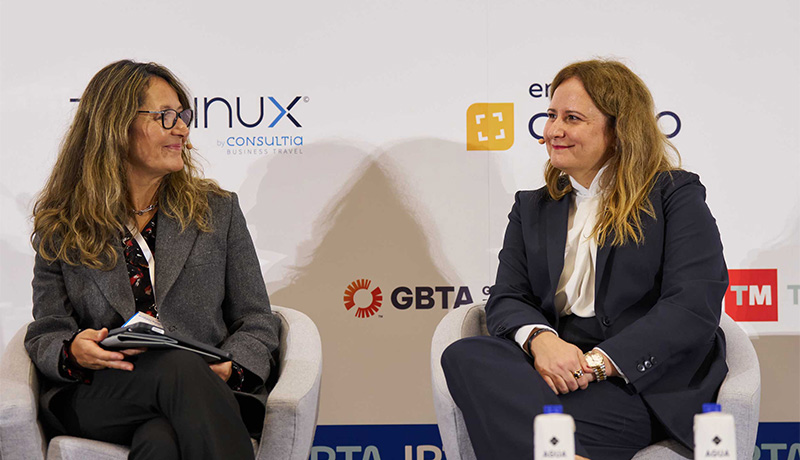 Leticia Alcalá, Directora de Ventas de Lufthansa Group en España, y Marina Vela, Head of Corporate Sales de Iberia, protagonizaron la primera mesa redonda del día analizando las tendencias y novedades en el sector aéreo, como el impacto de las tarifas NDC o las políticas de sostenibilidad en la experiencia del viajero.